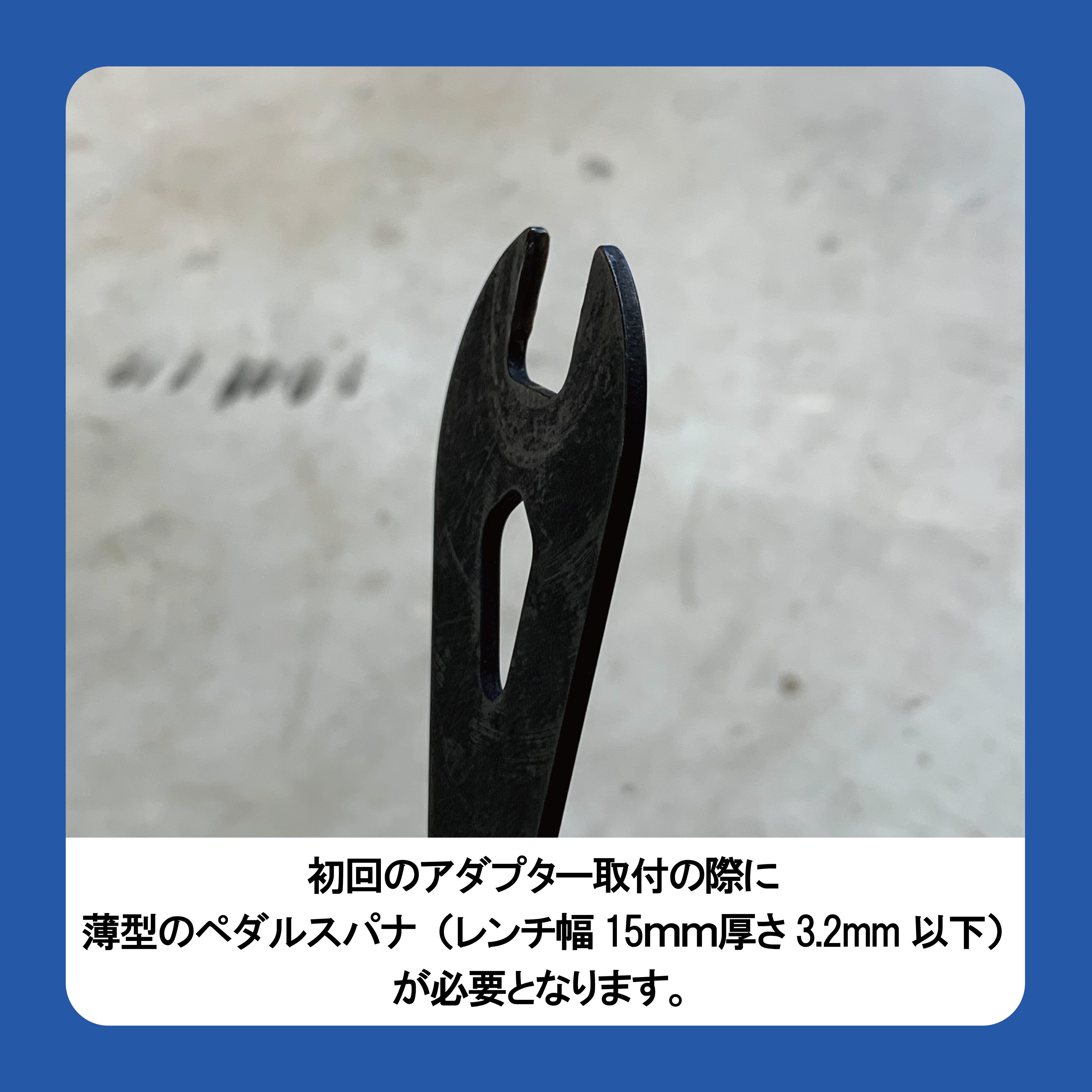注意点 :初回のアダプター取付には薄型のペダルスパナ(レンチ幅15mm厚さ3.2mm以下)が必要となります。(画像3枚目)